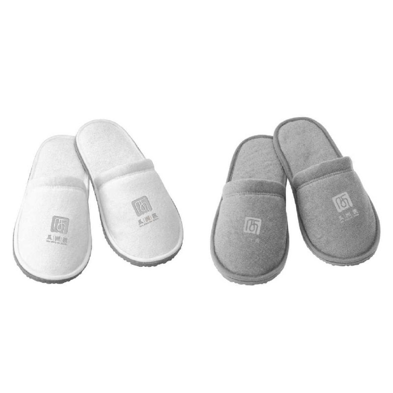 The slippers are elegant white and gray, allowing travelers to distinguish their slippers.