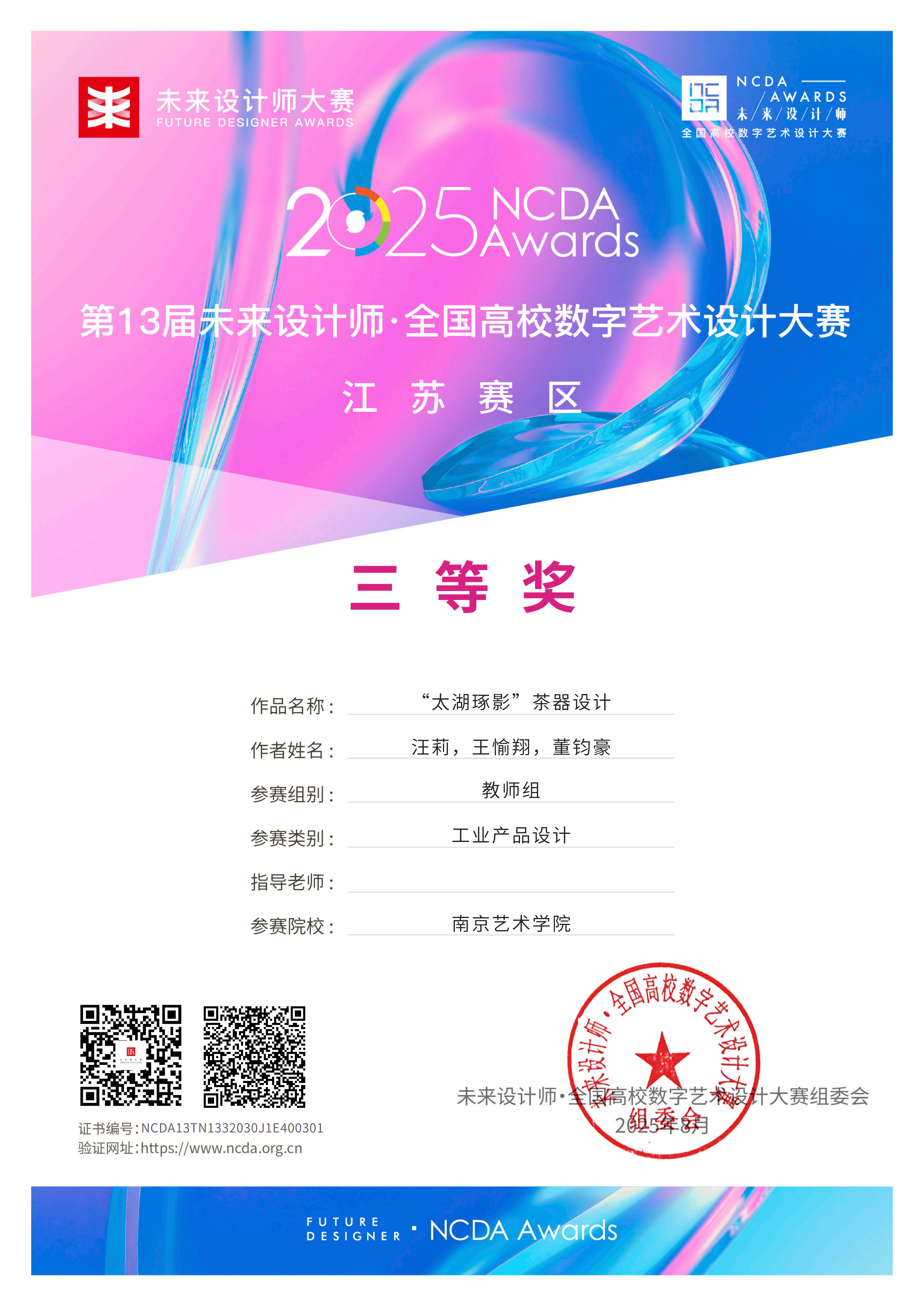 由南京艺术学院汪莉、王愉翔等教师组成的团队,凭借作品 “太湖琢影” 茶器设计,荣获工业产品设计类三等奖。